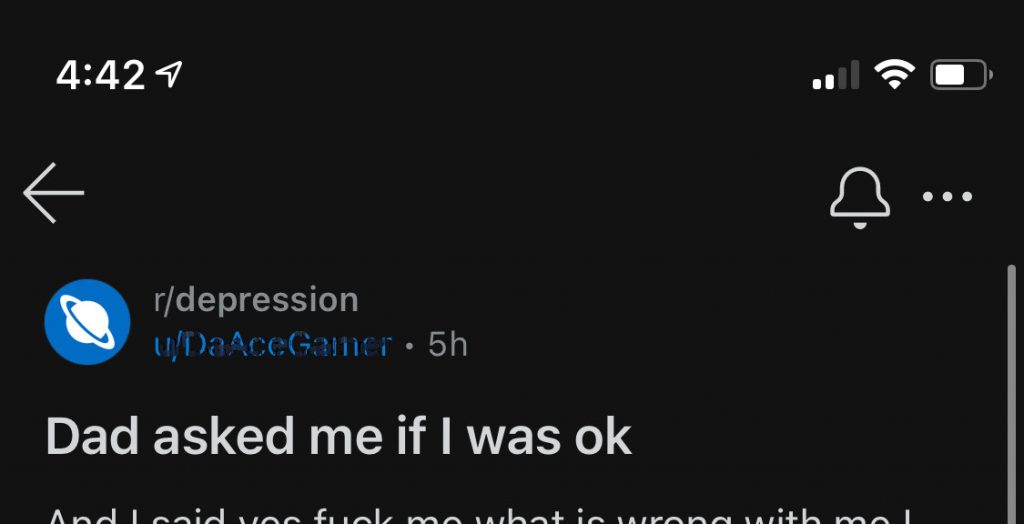 I saw this post online in the r/depression thread. The post was simple. “Dad asked me if I was okay.” I stared at it on my screen. I thought to myself, “what a simple thing to post a topic about… wonder why this was so important?” And also, “what a nice thing for their dad to do….” And that’s when it hit me. It’s not like my dad didn’t bring me soup or medicine when I was sick… but he’s never once asked me about my mental state.